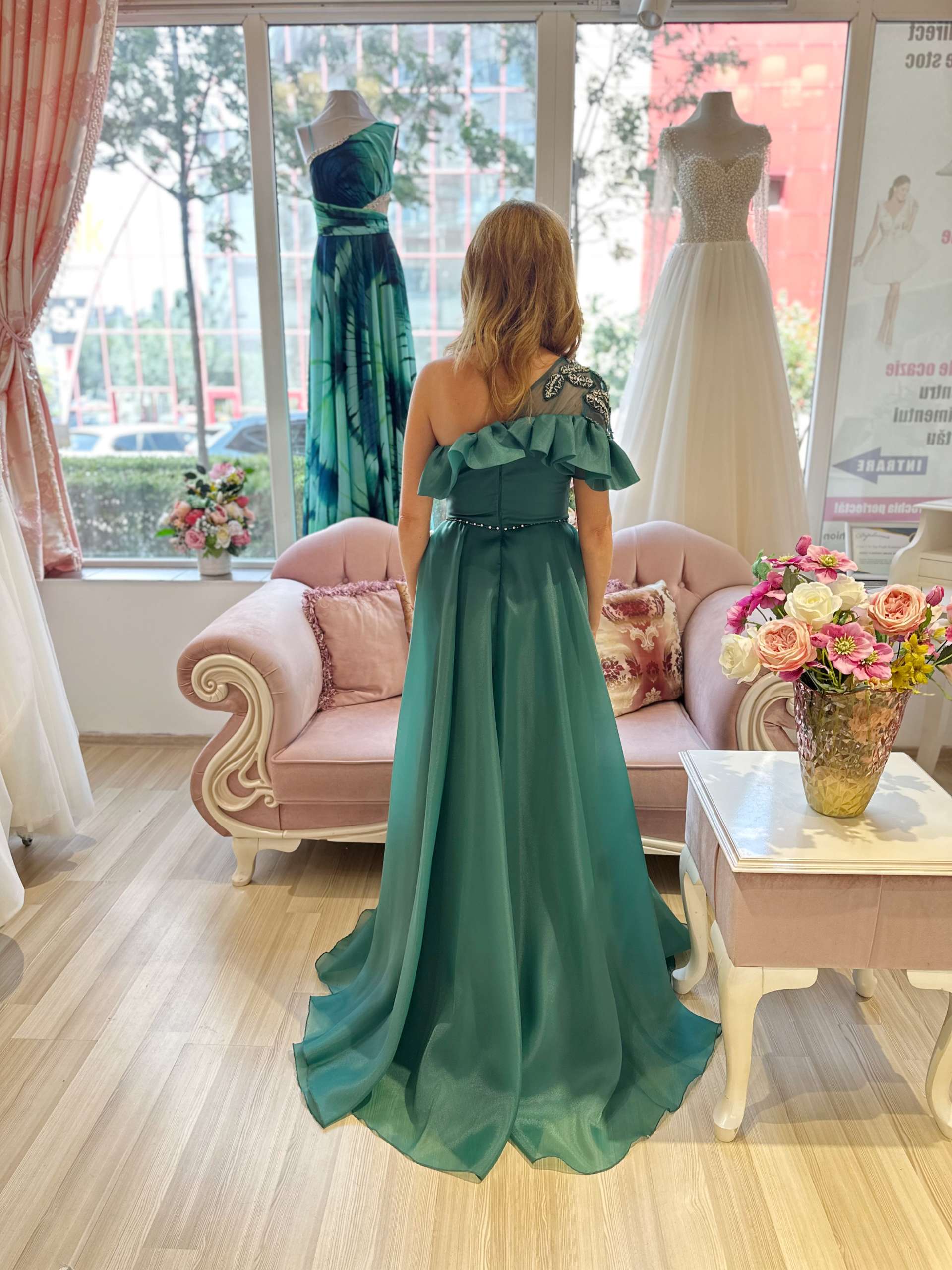 Rafinată și plină de personalitate, această rochie din organza verde smarald este alegerea ideală pentru un eveniment deosebit. Cu o croială într-un umăr, decorată cu un volan amplu și aplicații strălucitoare pe umăr și talie, rochia pune în valoare feminitatea și eleganța. Fusta lungă, lejeră și vaporoasă, are o deschidere frontală care oferă libertate de mișcare și un plus de senzualitate.